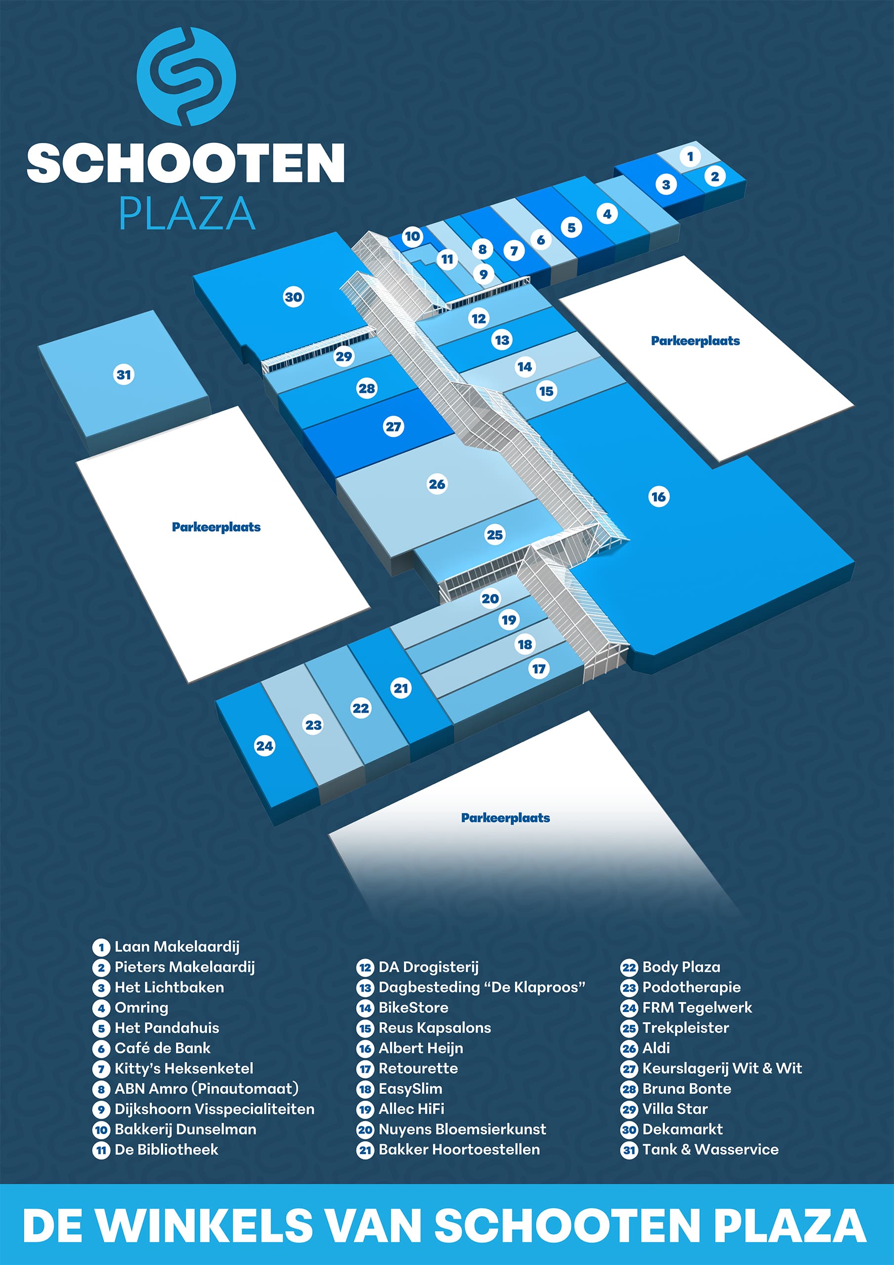 Ontdek het complete aanbod van Schooten Plaza. Van dagelijkse boodschappen tot mode, gezondheid, creativiteit en meer – alle winkels overzichtelijk bij elkaar.